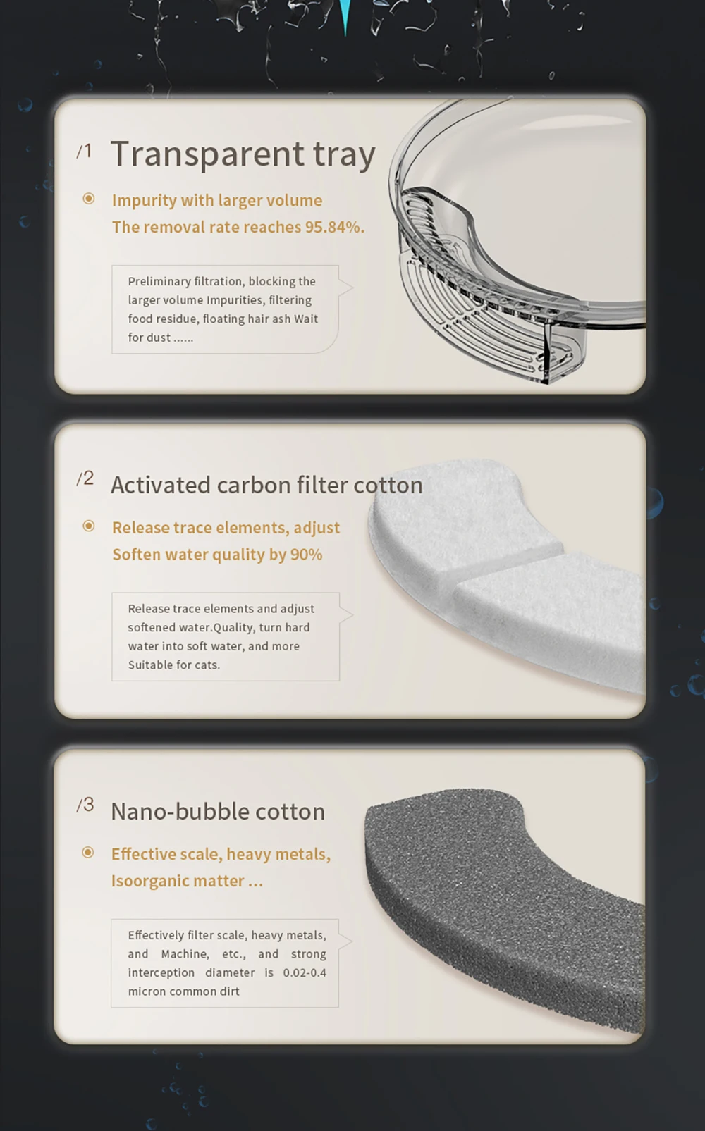 O filtro de quatro camadas refresca o fluido pelo seu sistema de circulação, o que segue o padrão necessário, mantém os animais de estimação longe de doenças gastrointestinais: melhora o sabor da água, desminerizando a água para reduzir o risco e bloqueando partículas grandes e poluentes de grande diâmetro, etc.